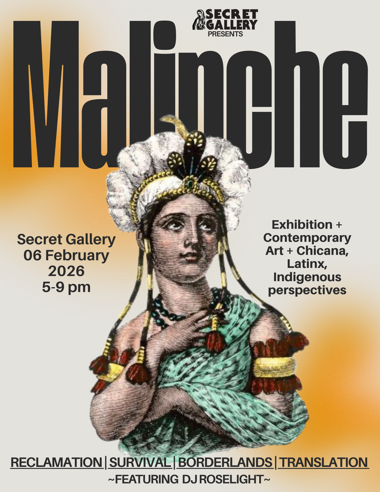 Secret Gallery is pleased to present Malinche, an exhibition opening February 6, 2026, featuring the work of 30+ Chicana, Latina, Indigenous and southwestern artists who carry forward the legacy of Malinche, also known as Malinzin or Doña Marina. Rather than revisiting her as a historical subject alone, the exhibition positions Malinche as an inherited presence: one whose strategies of survival, translation, and adaptation continue to shape the experience of women navigating language, power, and identity today.